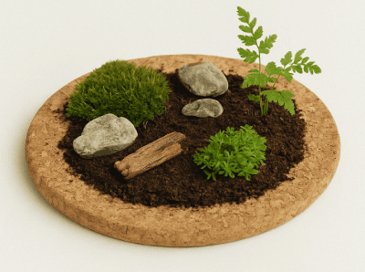 코르크 보드 위에 모스, 나무조각, 돌로 구성된 평면형 디자인